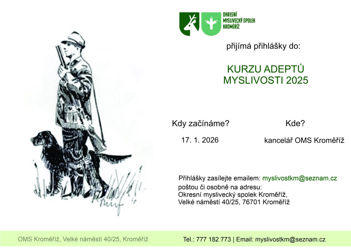 Kurz nových adeptů myslivosti ročníku 2026/2027 začíná 17. ledna 2026 v kanceláři OMS Kroměříž.